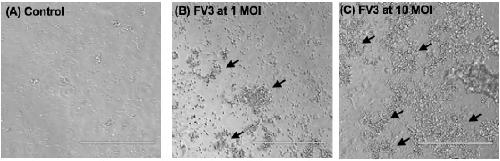 Figure 3. Increased Bd aggregation in the presence of FV3. Zoospores were incubated without (A) or with FV3 at 1 MOI (B) and 10 MOI (C). Zoospore aggregation was photographed at 1 h post-FV3 addition. Arrows: aggregated Bd.