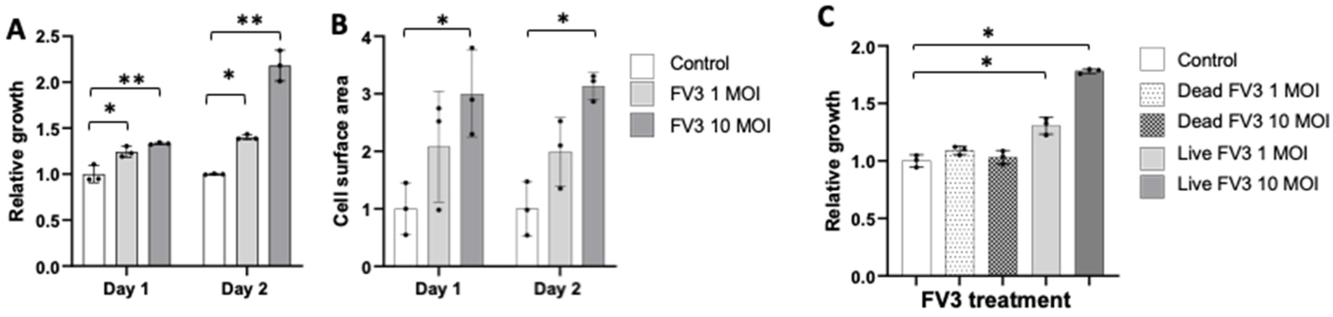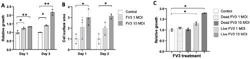 Figure 4. Effect of FV3 on Bd growth. Bd zoospores were co-cultured with FV3 at 1 and 10 MOI for 24 h and 48 h. Growth was determined by ATP consumption (A,B) and by determining the total Bd cell surface area per field of view (C). Negative control Bd was heat-inactivated (B). For all panels three replicates per condition were used. Statistical differences: ** (p < 0.01), * (p < 0.05).