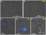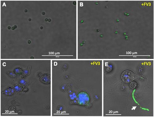 Figure 5. FV3 infection of Bd detected using fluorescence microscopy. FV3 was added to Bd culture at 1 MOI in 1 mL volume and incubated for 24 h. Detection of FV3 was performed by staining with the anti-53R rabbit polyclonal Ab followed by FITC-conjugates goat anti-rabbit Ab (green). Nuclei were stained with Hoechst (blue). (A,C) Negative control, Mock FV3-exposed Bd culture displaying no FITC signal. (B) FV3-exposed Bd zoospores displaying FITC signal indicating active infection. (C,D,E) Higher magnification of mock- (C) and FV3-exposed Bd zoosporangia (D,E) with FITC signal. Arrow: Chytrid rhizoid with strong FITC signal.