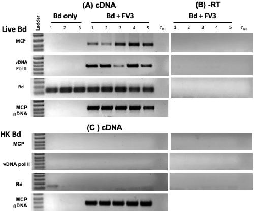 Figure 6. FV3 infection of Bd detected using RT-PCR. FV3 was incubated with Bd at 1 MOI in 1 mL volume for 24 h. RT-PCR on DNAse-treated RNA was performed using a primer specific for early (vDNA pol) and late (MCP) FV3 genes (A). To control for viral genomic contamination, the same amount of RNA was assayed in absence of reverse transcriptase (B). As an additional control, the same assay was performed with heat-killed Bd (C).