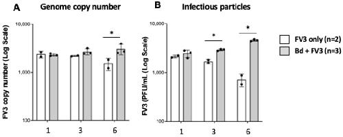 Figure 7. Detection of productive Bd infection by FV3. FV3 was incubated with Bd at 1 MOI in 1 mL volume for 1, 3, and 6 days. Viral replication was determined by qPCR ((A); genome copy number) and the production of infectious particles by plaque assay (B). * Statistical differences (p < 0.05).