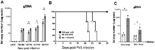 Figure 8. Effect of exposure to FV3 on host resistance to Bd infection in X. tropicalis. Adult X. tropicalis were infected with 1 × 106 Bd (zoospores) for 15 days before being exposed to 1 × 106 PFU FV3 (or shame-exposed). (A) Bd load was monitored by skin swabs at 15 days before FV3 infection and at 1, 3, and 6 days post-FV3 infection. (B) Survival of animals (N = 3) infected with Bd only or exposed after 15 days to FV3. (C) Bd loads of animals that succumbed from the infection. * Statistical differences (p < 0.05).