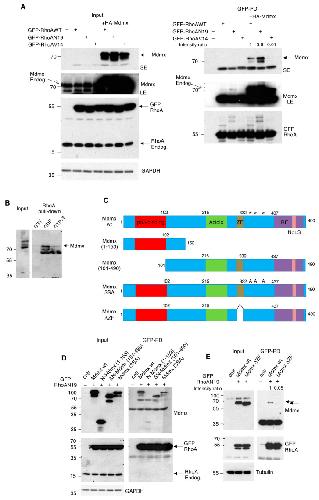 Figure 4. Mdmx is required for RhoA stabilisation and activation induced upon NEDDylation inhibition. (A) A375 cells transfected with control or Mdmx siRNAs for 72 h were then treated with cycloheximide (30 μg/mL), cells were harvested at the indicated times before Western blot analysis of cell extracts. Right graph represents the quantification of RhoA levels in the experiment. Values represent the mean of three independent experiments ± SD. (B) A375 cells transfected with control or Mdmx siRNAs were then transfected with control empty vector or wild type GFP-RhoA constructs as indicated. To prevent RhoA degradation, proteasome inhibitors (MG132, 30 μM, 5 h before harvesting) were used. Upon GFP-RhoA pull-downs (PD) the eluates were blotted with anti-ubiquitin antibodies. SE: Short exposure, LE: Long exposure. (C) A375 cells were treated with MLN4924 (100 nM) for the indicated times, and cell lysates were analysed using Western blotting as indicated. (D) A375 cells were transfected with either control or GFP-tagged wild type RhoA and treated with MLN4924 (100 nM) for the indicated times. To prevent RhoA degradation, proteasome inhibitors (MG132, 30 μM, 5 h before harvesting) were used for all indicated time points. GFP trap pull-down (right panel) was performed, and RhoA ubiquitination was analysed using Western blotting.