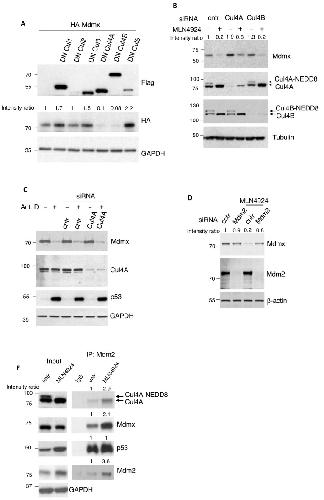 Figure 2. Mdmx degradation induced upon NEDDylation inhibition requires inactive Cullin4A and Mdm2. (A) A375 cells were co-transfected with different dominant negative-expressing Flag-tagged Cullin constructs (3 μg) and HA-Mdmx (3 μg). After 48 h post-transfection, total cell extracts were used for Western blotting as indicated. (B) A375 cells were transfected with either control, Cullin4A, or Cullin4B siRNAs followed by MLN4924 treatment (1 μM, 15 h). After 48 h post-transfection, cell extracts were used for Western blotting against the indicated proteins. (C) Experiment performed as in B using Actinomycin D treatment (5 nM, 15 h). (D) A375 cells were transfected with Mdm2-targeting siRNAs and treated as indicated (MLN4924, 1 μM, 15 h), before extracts were analysed by Western blotting using indicated antibodies. (E) A375 cells were treated with MLN4924 (1 μM, 6 h, conditions where Mdmx levels are not significantly affected) and extracts were used for immunoprecipitations using 4B2 anti-Mdm2 antibody. Western blot analysis on immunoprecipitates and total cell extracts was performed with the indicated antibodies.