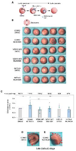 Figure 7. Mdmx and RhoA-dependent effect of MLN4924 treatment on Xenopus gastrulation. (A) Schemes of Xenopus embryo external morphology at four consecutive stages of gastrulation. The onset gastrulation is marked by the appearance of pigmented cells that outline the future blastopore (arrowhead). A flow of mesoderm internalisation is established (blue arrows), starting on the dorsal side and propagating all around to form the so-called blastopore lip. As internalisation progresses, the blastopore progressively shrinks. Its complete closure marks the end of gastrulation. (B) Representative images of five embryos per condition, from the same experiment, imaged at the mid–late blastula (stage 12). The embryos were oriented bottom-up to view the blastopore (arrows). Embryos were injected at the two cell stage with control morpholino (COMO), Mdmx-specific MO (MdmxMO), or mRNA coding for dominant negative RhoA N19 (dnRhoA). From blastula stage on, embryos were incubated in the presence of 20 μM MLN4924. Solvent DMSO (1/500) was used as negative control. Scale bar, 500 μm. (C) Quantification of relative blastopore area, normalised for each experiment to the average area of COMO-DMSO controls. Total number of embryos and number of independent experiments are indicated at the top of the graph. The coloured dots indicate the mean values for each experiment. Statistical comparison: non-parametric Anova (Kruskal–Wallis) followed by post hoc Dunn’s test. p-values, * < 0.05, ** < 0.01. (D,E) Examples of control and MLN4924-treated embryos at a late stage (tailbud). (D) The embryo has become thin and elongated (red double arrowhead). It is curved because still confined by the transparent egg shell. The anterior part (asterisk) shows well-defined head structures (purple arrow, optic anlage). (E) MLN4924-treated embryos show a typical phenotype resulting from moderately defective gastrulation. The embryo axis has remained much shorter, and the head structures are missing. Scale bar, 500 μm.