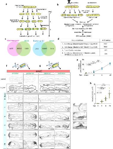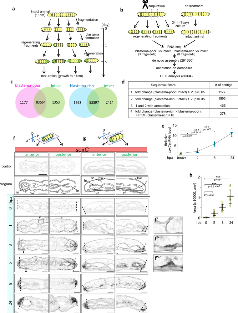 Enchytraeus japonensis grows to about 10 mm in length and reproduces asexually by fragmentation approximately every 2 weeks. b Workflow of transcriptomic analyses during regeneration. Intact worms were amputated into 3 fragments (blastema-poor group) or 8 fragments (blastema-rich group). c Venn diagrams depicting selectively upregulated contigs in regenerating animals (blastema-poor and blastema-rich groups) compared with that of intact animals. d Sequential filters to select upregulated contigs in regenerating worms. We selected the genes that showed higher upregulation in the blastema-rich than in the blastema-poor group based on the FPKM value (>10). e Expression level of soxC during regeneration. soxC was upregulated at 2, 6, and 24 hpa. n = 5 for intact animals and for each time point. Error bars indicate the standard error of the mean (S.E.M.). f,