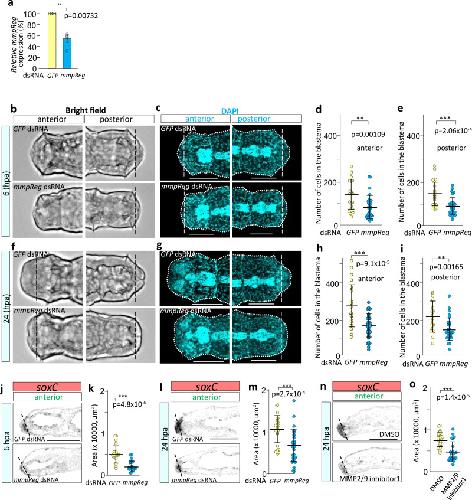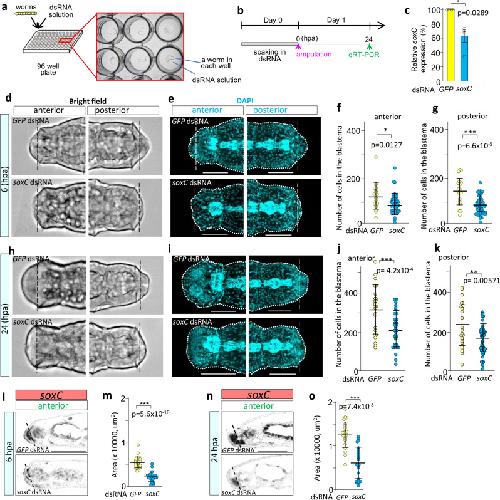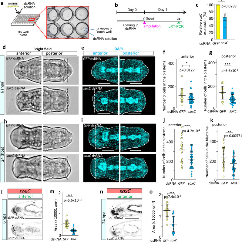 g). h, i Representative images of RNAi animals at 24 hpa. Bright-field images (h). The nuclei were stained with DAPI (i). j, k RNAi of soxC reduced the number of cells in both the anterior blastema (GFP RNAi (n = 25), soxC RNAi (n = 36), p = 4.2 × 10−4) (j) and posterior blastema (GFP RNAi (n = 25), soxC RNAi (n = 38), p = 0.0057) (k). Representative of two independent experiments (j, k). l–o