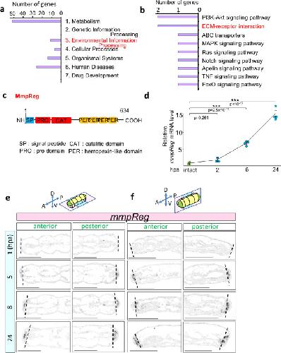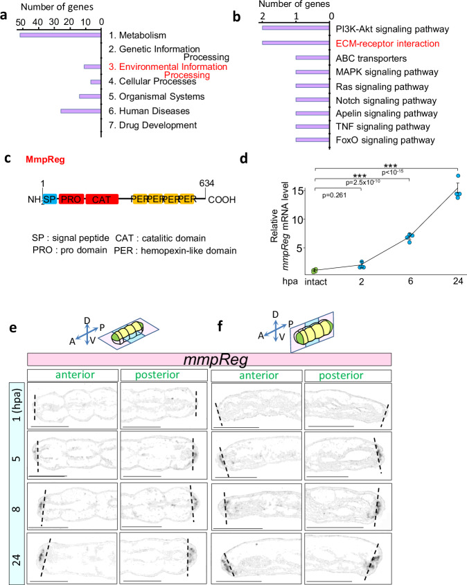 Fig. 3. mmpReg and blastema formation.a KEGG pathway categories of frequently detected genes differentially expressed between regenerating and intact animals. b The KEGG pathway subcategories of frequently detected genes are categorized as environmental information processing in the upper panel. c Schematic of the predicted MmpReg structure of E. japonensis. d Expression level of mmpReg during regeneration. mmpReg was upregulated after 2, 6, and 24 hpa. ***p < 0.001 (Dunnett’s test). Error bars indicate S.E.M. n = 5 for intact animals and for other time points. e, f