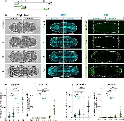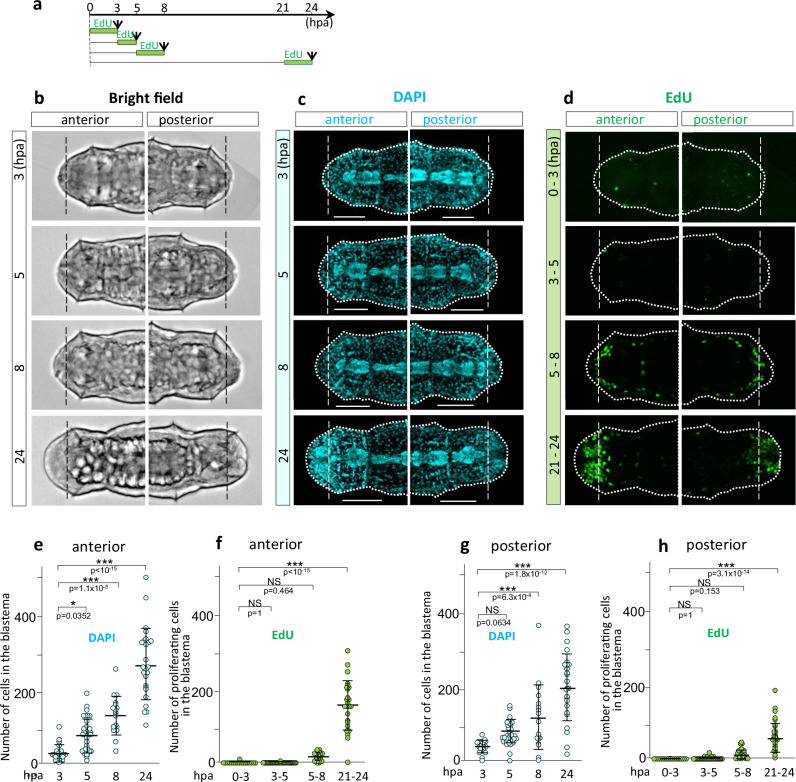 Fig. 5. Distribution of proliferating cells in blastema formation.a Schematic drawing of EdU labelling. Small arrows indicate the fixation points with PFA–PBS. b, c, d Representative images of regenerating animals at 3, 5, 8 and 24 hpa. Bright-field images (b). The nuclei were stained with DAPI (c). EdU-incorporated cells (d). e, f, g, h The number of cells increased in both anterior blastema (e, 3 hpa (n = 18), 5 hpa (n = 32), 8 hpa (n = 18), 24 hpa (n = 25)) and posterior blastema (g, 3 hpa (n = 19), 5 hpa (n = 32), 8 hpa (n = 18), 24 hpa (n = 25)). The number of proliferating cells did not significantly increase (0–3 vs 3–5, 0–3 vs 5–8 hpa), but increased at 21–24 hpa (0–3 vs 21–24 hpa) in anterior and posterior blastema (d,