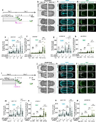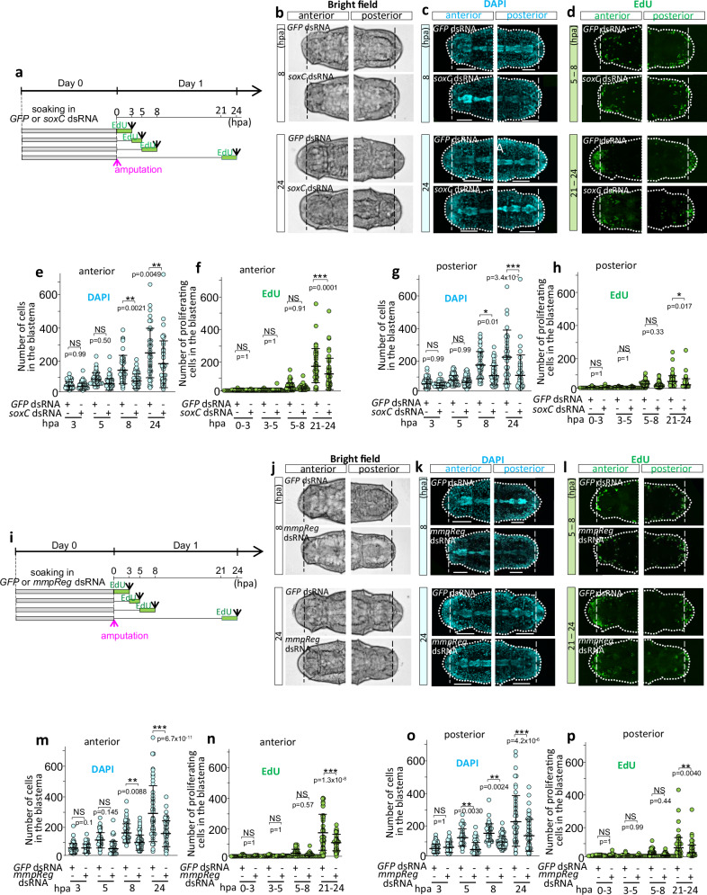 (n = 44), 8 hpa (GFP (n = 43), soxC (n = 44)), 24 hpa (GFP (n = 40), soxC (n = 42)) in the anterior blastema (e) and 3hpa (GFP (n = 40), soxC (n = 42)), 5 hpa (GFP (n = 46), soxC (n = 41)), 8 hpa (GFP (n = 43)), soxC (n = 44)), 24 hpa (GFP (n = 38), soxC (n = 38)) in the posterior blastema (g). Quantification of EdU-incorporated cells in the anterior blastema (f) and posterior blastema (h). i Schematic drawing of EdU labelling in mmpReg RNAi worms. Small arrows indicate the fixation points with PFA–PBS. j, k, l Representative images of regenerating animals at 8 and 24 hpa. Bright-field images (j). The nuclei were stained with DAPI (k). EdU-incorporated cells (l). m, n, o,