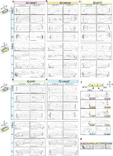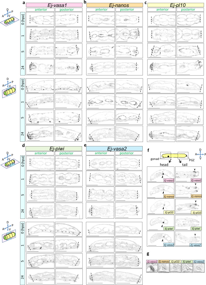 Fig. 7. Expression of GMP genes during blastema formation in E. japonensis.a–e GMP gene (Ej-vasa1 (a), Ej-nanos (b), Ej-pl10 (c), Ej-piwi (d), Ej-vasa2 (e)) expression during blastema formation at 0, 1, 5, and 24 hpa in horizontal sections (upper eight panels) and sagittal sections (lower eight panels). Dashed lines indicate amputation sites. f GMP gene expression in gonad and PGZ at 0 hpa. Expression level varies depending on the GMP gene, but all GMP genes were expressed in the gonad and PGZ, except for Ej-piwi in PGZ at 0 hpa. Arrowheads in the left panels indicate the position of the gonad, and arrowheads in the right panels indicate the position of PGZ. g GMP gene expression in neoblast at 0 hpa. Ej-vasa1 was expressed in neoblasts, whereas the other GMP genes were not detected in neoblasts at 0 hpa. The regions around the septa are shown in each panel. Dotted lines indicate the outline of neoblasts. Scale bars represent 250 µm (a–f) and 20 µm (g). A: anterior, P: posterior, D: dorsal, V: ventral (a–f). All images are representative of at least two independent experiments (a–g).