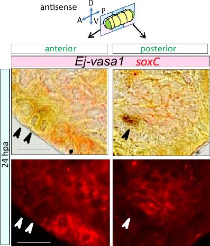 Fig. 8. Double ISH of soxC and Ej-vasa1 in blastema formation.DIG-labeled soxC and fluorescence-labeled Ej-vasa1 RNA antisense probes were used for double ISH in horizontal sections of regenerating worms at 24 hpa. Arrowheads indicate the position of Ej-vasa1-expressing cells. Scale bars represent 25 µm. Representative of two independent experiments.