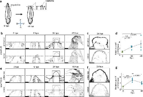Xl-sox11 expression during blastema formation at 0, 6, 24 and 48 hpa. The sense controls are shown on the lower panels. f Magnified view of the boxed areas in (e, 24 hpa). g Expression level of Xl-sox11 during blastema formation. Xl-sox11 was upregulated after amputation. n = 4 for time points. (d, g) Error bars indicate S.E.M. *p < 0.05, **p < 0.01, ***p < 0.001 (Dunnett’s test). Dashed lines indicate amputation sites (a,