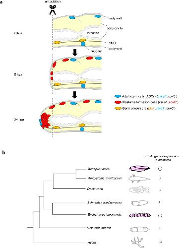 Fig. 10. Model for blastema formation in E. japonensis.a GMP gene(s)-expressing cells (ASCs, shown in blue) are present in intact worms. soxC-expressing cells (shown in red) might be the cells supplied to the amputation site. The relationship between soxC-expressing cells and ASCs remains unclear. soxC-expressing cells were distinct from the population of cells on the VNC (shown in orange), which are Ej-piwi-positive cells that serve as germ cell precursors. b Similarity in expression dynamics of SoxC genes in E. japonensis and X. laevis raised the possibility of the common cellular mechanisms underlying blastema formation in both species. In the cnidarian polyp Hydra vulgaris, HvSoxC was expressed in a transition state between i-cells and differentiated cells63 (*).