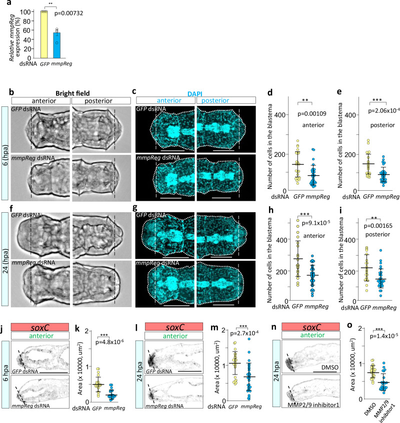 Fig. 4. mmpReg promotes blastema formation.a qPCR for the RNAi-mediated downregulation of mmpReg transcripts at 24 hpa (n = 4, biologically independent sample pools, p = 0.00732). Error bars indicate S.E.M. b, c Representative images of animals at 6 hpa. Bright-field images (b). The nuclei were stained with DAPI (c). d, e RNAi of mmpReg reduced the number of cells in both the anterior blastema (GFP RNAi (n = 22), mmpReg RNAi (n = 30), p = 0.00109) (d) and posterior blastema (GFP RNAi (n = 22), mmpReg RNAi (n = 29), p = 2.06 × 10−4) (e). Representative of two independent experiments (d, e). f, g Representative images of animals at 24 hpa. Bright-field images (f). The nuclei were stained with DAPI (g). h, i RNAi of mmpReg reduced the number of cells in the anterior blastema (GFP RNAi (n = 20), mmpReg RNAi (n = 32), p = 9.1 × 10−5) (h) and posterior blastema (GFP RNAi (n = 20), mmpReg RNAi (n = 31), p = 0.00165) (i). Representative of two independent experiments (h,