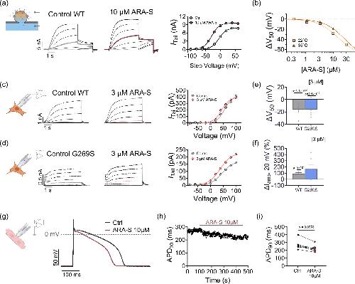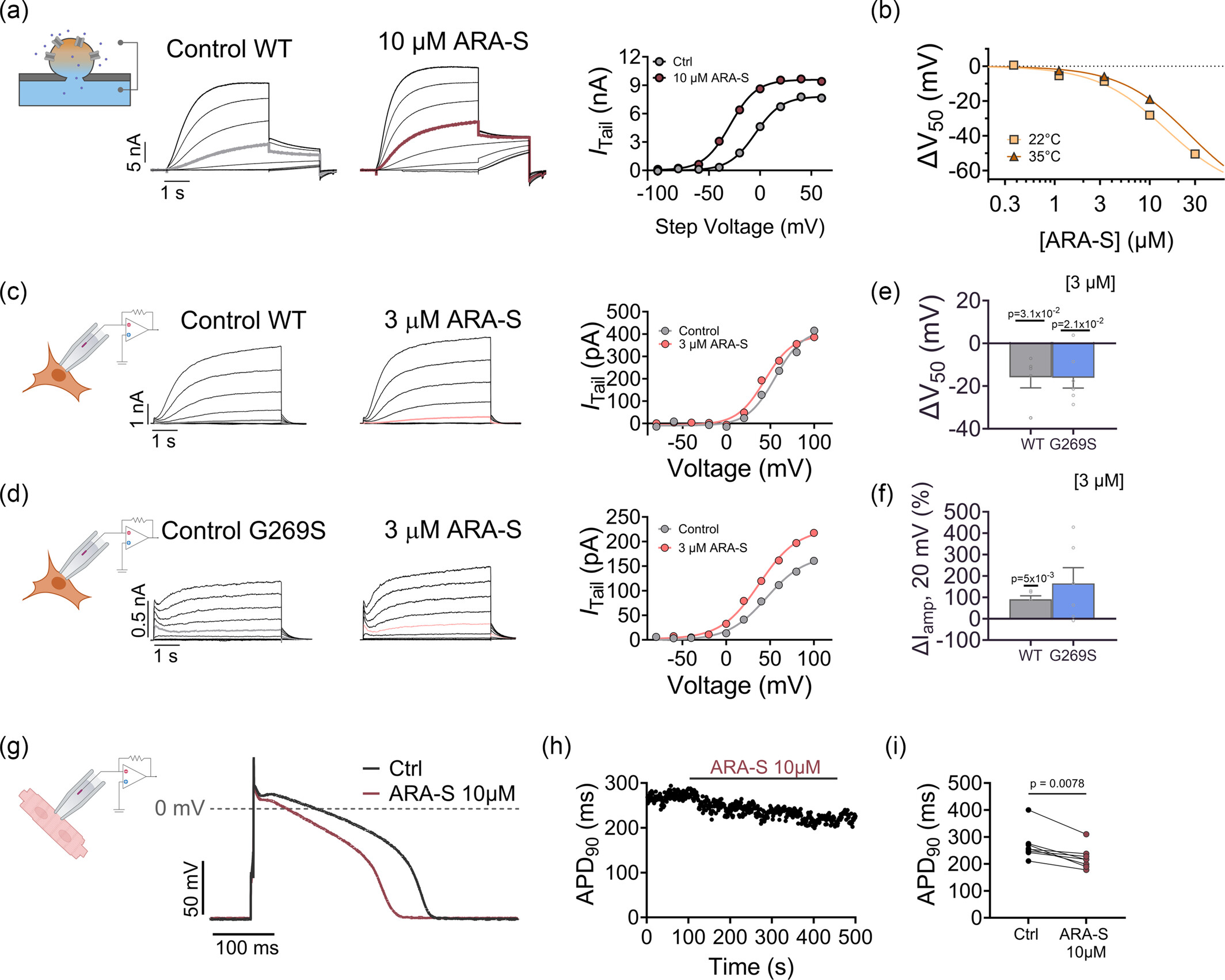 FIGURE 5ARA-S facilitates activation of WT and mutant KV7.1/KCNE1 in mammalian cells and shortens LQT1 rabbit ventricular AP duration. (a) Cartoon of automated patch-clamp and representative traces of WT KV7.1/KCNE1 currents from CHO cells under control conditions and in the presence of 10 μM ARA-S (grey, in control, and red trace, in ARA-S, indicate an activating voltage step to −20 mV) and corresponding G(V) curve. For this specific cell: V50;ctrl = −4.7 mV, Itailmax;ctrl = 7.8 nA, V5duration0; 10 μM ARA-S = −29.3 mV, Itailmax; 10 μM ARA-S = 9.6 nA. Currents were generated in steps from −100 to +60 mV in 20 mV steps, followed by a tail voltage of −20 mV. The holding voltage was −90 mV. (b) Concentration–response curve showing the ΔV50 effect of ARA-S on WT KV7.1/KCNE1 in CHO cells. The curves represent the best fit of Equation (4) in Supporting Information Methods. Best fit for 22°C: EC50 = 15.0 μM, ΔV50, max = −72.8 mV. Best fit for 35°C: EC50 = 26.4 μM, ΔV50, max = −78.6 mV. Statistics and n-values are indicated in Table S6. Data are shown as mean ± SEM. Small error bars are covered by symbols. (c) Cartoon of manual patch-clamp in HEK293 cells and representative traces of WT KV7.1/KCNE1 currents from HEK293 cells under control conditions and in the presence of 3 μM ARA-S (grey, in control, and red trace, in ARA-S, indicate an activating voltage step to +20 mV) and corresponding G(V) curve. For this specific cell: V50;ctrl = +55.0 mV, Itailmax;ctrl = 0.4 nA, V50; 3 μM ARA-S = +43.8 mV, Itailmax; 3 μM ARA-S = 0.4 nA. Currents were generated in steps from −80 to +100 mV in 20 mV steps, followed by a tail voltage of −40 mV. The holding voltage was −90 mV. (d) Same as in Figure 5c but for KV7.1(G269S)/KV7.1/KCNE1. For this specific cell: V50;ctrl = +46.0 mV, Itailmax;ctrl = 0.2 nA, V50; 3 μM ARA-S = +37.7 mV, Itailmax; 3 μM ARA-S = 0.2 nA. (e) Mean ΔV50 and (f) ΔIamp, 20 mV induced by 3 μM of ARA-S in WT and KV7.1(G269S)/KV7.1/KCNE1. Data are shown as mean ± SEM; n = 5–6. Statistics indicate one sample t-test to compare to a hypothetical value of 0. A t-test comparison between WT and the G269S mutant showed no statistical difference between the groups (ns). Only significant differences are indicated. All other comparisons are non-significant (ns). (g) Cartoon of manual patch-clamp in rabbit cardiomyocytes and representative action potential trace before (ctrl, black line) and after perfusion of 10 μM ARA-S (red line). (h) Corresponding time course of the APD90 over time obtained in an exemplary left ventricular cardiomyocyte from LQT1 rabbit heart. (i) Average APD90 between control condition and 10 μM ARA-S. Data are shown as mean ± SEM; n = 7 cells, n = 2 rabbits. Statistics indicate non-parametric paired Wilcoxon test.