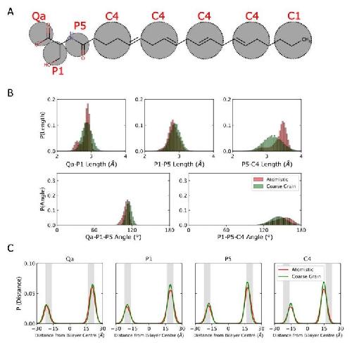 bilayer was compared between atomistic (green) and CG (red) simulations. For comparison, the
