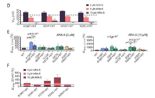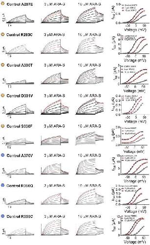 17.5 mV, Itailmax; 10 µM ARA-S = 2.4 µA. D301V: V50;ctrl = +20.3 mV, Itailmax;ctrl = 0.3 µA, V50; 3 µM ARA-S = +2.9 mV,