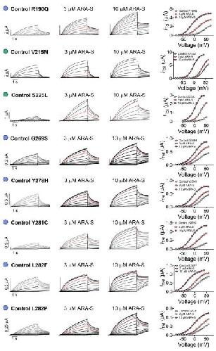 12.2 mV, Itailmax; 10 µM ARA-S = 5.0 µA. V215M: V50;ctrl = +39.4 mV, Itailmax;ctrl = 6.3 µA, V50; 3 µM ARA-S = +33.3