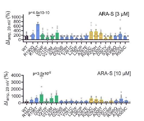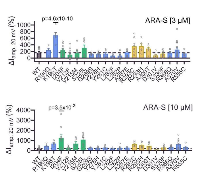 ARA-S induced increase in current amplitude for each mutant is multiplied with the control