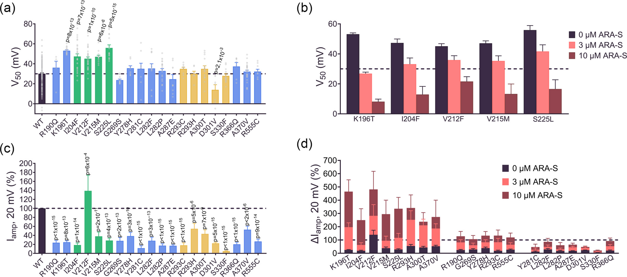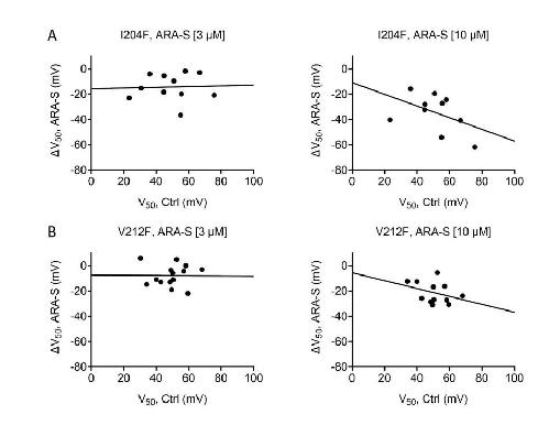 studied using two-electrode voltage clamp. V50 induced by 3 µM (left) or 10 µM (right) of ARA-S as a