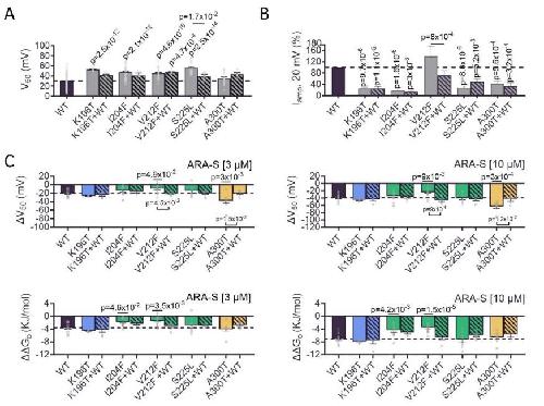 mutant RNA, as described in Material and Methods, in Xenopus oocytes and channels studied usingtwo-electrode voltage clamp. Homozygous conditions are represented by uniform bars and
