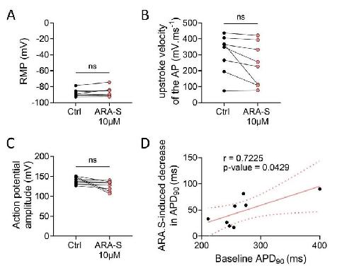 velocity of the upstroke and C) amplitude of the AP. Statistics indicate paired t-test. ns = nonsignificant (n = 7 cells, N = 2 rabbits). D) Correlation between the ARA-S-induced decrease in APD90