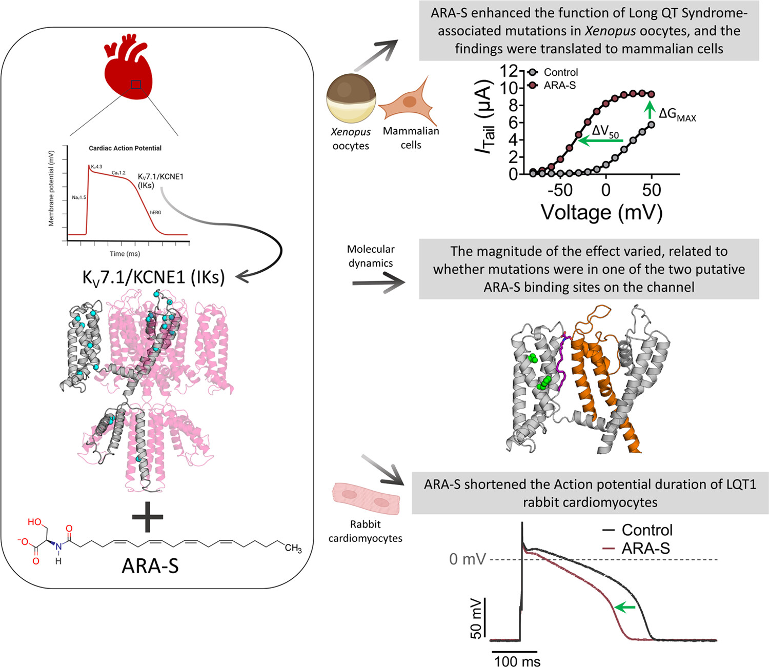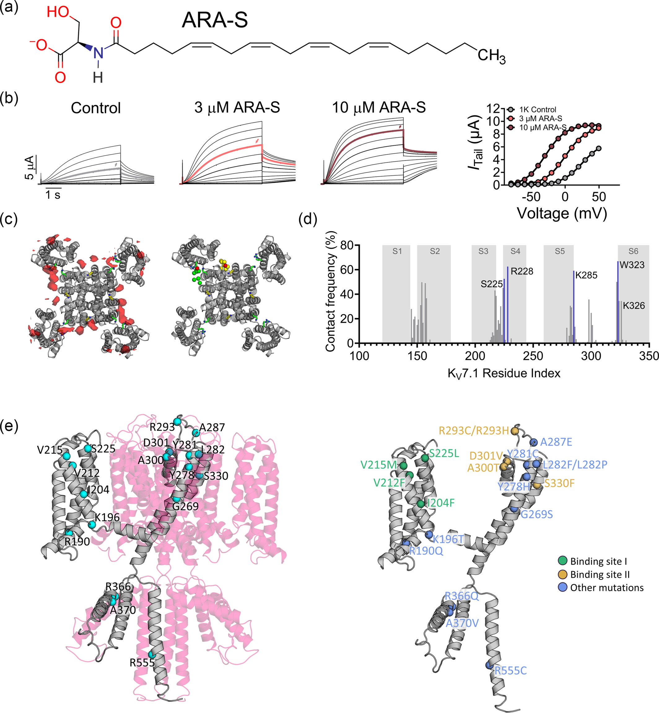 FIGURE 1ARA-S activates the WT KV7.1/KCNE1 channel using two putative binding sites. (a) Molecular structure of the endocannabinoid ARA-S. (b) Representative traces of WT KV7.1/KCNE1 currents under control conditions and in the presence of 3 and 10 μM ARA-S (grey, in control, and red traces, in 3 and 10 μM ARA-S, indicate an activating voltage step to +20 mV) and corresponding G(V) curve and normalised ITail for better visualisation of the V50 shift effect. For this specific cell: V50;ctrl = +25.3 mV, Itailmax;ctrl = 6.9 μA, V50; 3 μM ARA-S = +0.5 mV, Itailmax; 3 μM ARA-S = 9.1 μA, V50; 10 μM ARA-S = −29.3 mV, Itailmax; 10 μM ARA-S = 9.5 μA. Currents were generated in steps from −80 to +50 mV in 10 mV steps, followed by a tail voltage of −20 mV. The holding voltage was −80 mV. (c) Densities of ARA-S headgroup beads calculated from CG simulations of the KV7.1 structure (PDB: 6V00) illustrated at an isosurface value of 1.25 beads nm−3. (d) Normalised number of contacts between KV7.1 residues and ARA-S headgroup beads in CG simulations. A contact was assumed if a residue's bead was within 4.5 Å of an ARA-S bead and residues with a contact frequency >50% are coloured blue. (e) (left) Side view of the hKV7.1 (PDB: 6V00) indicating localisation of studied LQTS-associated mutations. One subunit of the channel is highlighted in grey. The cyan spheres highlight the location of the LQTS-associated mutations. (right) Side view of one subunit in which the residues have been coloured according to their location. Residues adjacent to the ARA-S Site I are coloured green, residues adjacent to the ARA-S Site II are coloured yellow, and other mutations are coloured blue.