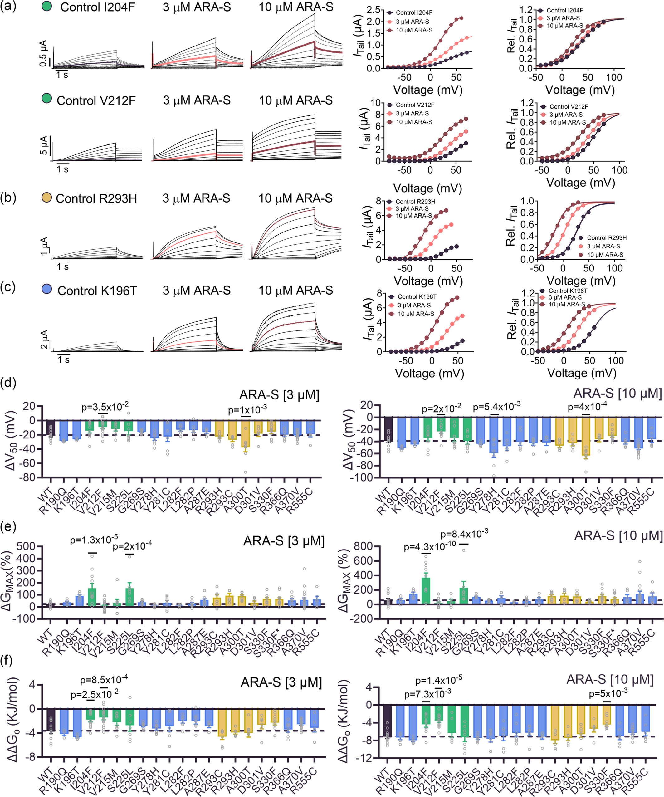 FIGURE 2ARA-S enhances the function of all LQTS mutants, with differences in the magnitude of effects. Effect of 3 and 10 μM ARA-S on KV7.1/KCNE1 LQTS mutants expressed in Xenopus oocytes and studied with the two-electrode voltage clamp technique. Representative examples of (a) Site I mutants KV7.1_I204F/KCNE1 and KV7.1_V212F/KCNE1, (b) Site II mutant KV7.1_R293H/KCNE1 and (c) ‘other mutant’ KV7.1_K196T/KCNE1. Currents under control conditions and in the presence of 3 and 10 μM ARA-S (grey, in control, and red traces, in 3 and 10 μM ARA-S, indicate an activating voltage step to +20 mV), corresponding G(V) curve and normalised ITail to the predicted top value for better visualisation of the V50 shift effect are shown. For the specific KV7.1_I204F/KCNE1 cell shown in Figure 2a, top: V50;ctrl = +36.0 mV, Itailmax;ctrl = 0.7 μA, V50; 3 μM ARA-S = +32.0 mV, Itailmax; 3 μM ARA-S = 1.4 μA, V50; 10 μM ARA-S = +20.3 mV, Itailmax; 10 μM ARA-S = 2.4 μA. Note that this is one of the cells with a less rightward shifted V50 to allow for clarity in visualising the Boltzmann fit. For the specific KV7.1_V212F/KCNE1 cell shown in Figure 2a, bottom: V50;ctrl = +50.7 mV, Itailmax;ctrl = 4.1 μA, V50; 3 μM ARA-S = +39.4 mV, Itailmax; 3 μM ARA-S = 5.7 μA, V50; 10 μM ARA-S = +23.6 mV, Itailmax; 10 μM ARA-S = 7.6 μA. Note that this representative cell exhibits a larger GMAX increase compared to the mean values. For the specific KV7.1_R293H/KCNE1 cell shown in Figure 2b: V50;ctrl = +28.2 mV, Itailmax;ctrl = 2.2 μA, V50; 3 μM ARA-S = +4.0 mV, Itailmax; 3 μM ARA-S = 5.1 μA, V50; 10 μM ARA-S = −15.4 mV, Itailmax; 10 μM ARA-S = 6.9 μA. For the specific KV7.1_K196T/KCNE1 cell shown in Figure 2c: V50;ctrl = + 57.0 mV, Itailmax;ctrl = 2.9 μA, V50; 3 μM ARA-S = +28.9 mV, Itailmax; 3 μM ARA-S = 5.6, V50; 10 μM ARA-S = 6.2 mV, Itailmax; 10 μM ARA-S = 7.7 μA. Currents were generated in steps from −80 to +70 mV in 10 mV steps, followed by a tail voltage of −20 mV. The holding voltage was −80 mV. For KV7.1_V212F/KCNE1, a pre-pulse to −120 mV was used to force the closing of the channel before the activation steps. (d) Mean ΔV50, (e) ΔGMAX and (f) ΔΔG0 induced by 3 μM (left) and 10 μM (right) of ARA-S in indicated LQTS mutants. Black bar represents WT, green bars indicate mutants located near binding Site I, yellow bars indicate mutants located near binding Site II, and blue bars indicate mutations located outside putative binding sites. Dashed line denotes the effect of ARA-S in the WT KV7.1/KCNE1 channel (from Hiniesto-Iñigo et al., 2023). Because of the abnormal biophysical behaviour of S330F, with a prominent leak component, ΔGMAX was calculated as the ARA-S effect on ΔGMAX − ΔGMIN. This alternative analysis, which quantifies the voltage-dependent increase in G, is denoted as S330F*. ΔΔG0 was calculated as described in Section 2. Statistics indicate one-way ANOVA with Bonferroni's multiple comparison test and indicates the difference compared to the effect of ARA-S in WT. Only significant differences are indicated. All other comparisons are non-significant (ns). Data are shown as mean ± SEM; n = 5–21.