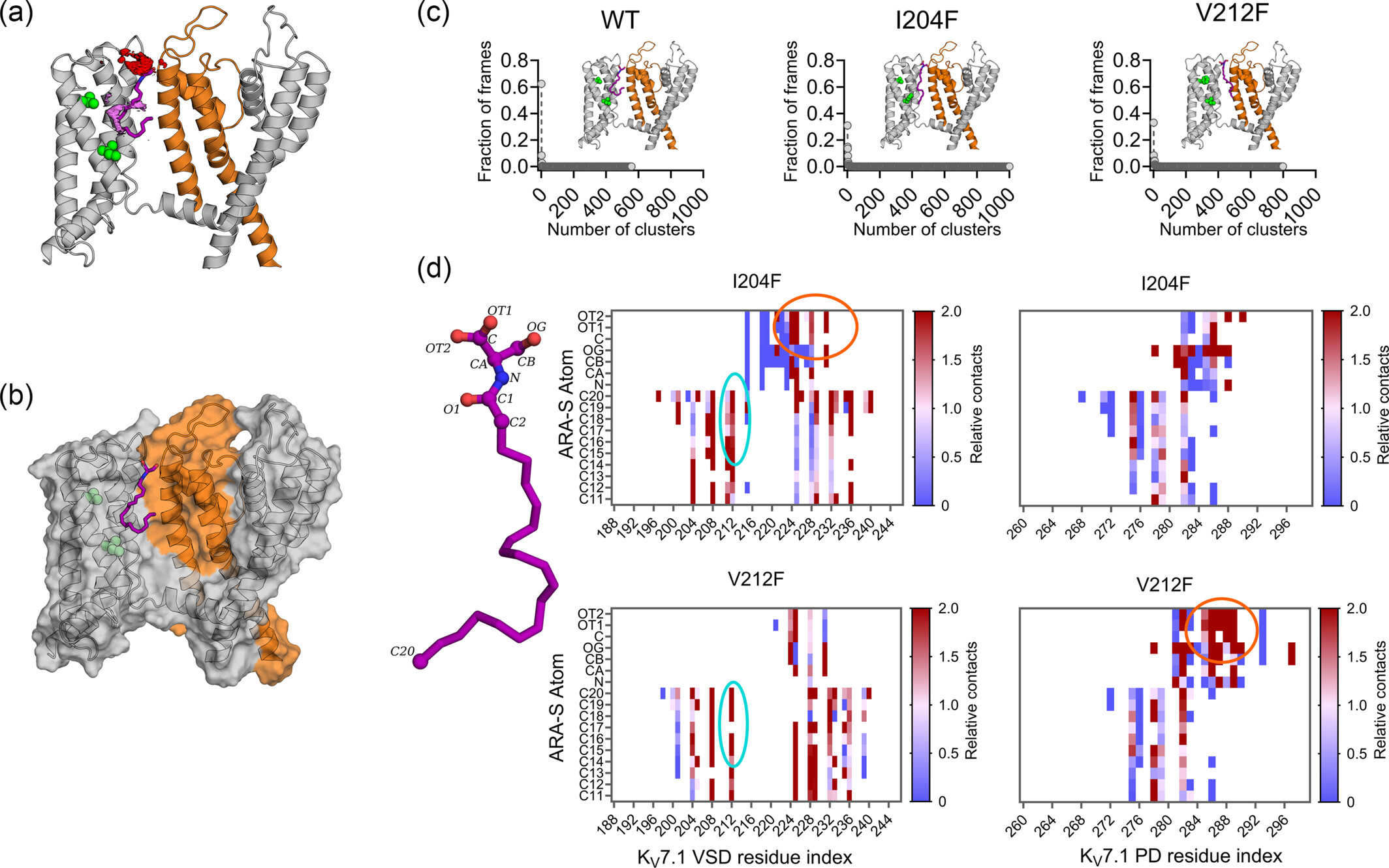 FIGURE 3Impairment of ARA-S binding by the aromatic rings in I204F and V212F. (a) Preferential residence sites of the ARA-S headgroups and tail from atomistic simulations illustrated in red and purple, respectively. The I204 and V212 residues are shown as green spheres. (b) Illustration of the hydrophobic pocket adjacent to the I204 and V212 residues permitting the preferential localisation of the ARA-S tail. (c) Stability of ARA-S at the VSD–PD interface within atomistic simulations of the WT, I204F and V212F KV7.1 channels assessed as the fraction of frames belonging to each cluster. For each simulation set, the most populated ARA-S cluster is illustrated in the inset. (d) Relative contact frequencies of ARA-S atoms with VSD (left) and PD (right) residues compared between simulations of the WT, I204F and V212F KV7.1 channels. A value greater than 1 signifies a weakening of interaction in comparison to WT (i.e. ARA-S atoms have weaker interaction with the mutant than WT) and vice versa. Cyan and orange circles illustrate the reduced interactions of the ARA-S tail and head groups, respectively.