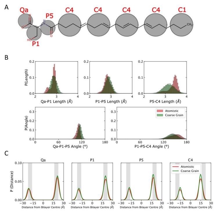 Supplementary Figure 1. Coarse-grain (CG) parameters for ARA-S. A) Illustration of the coarse-grain