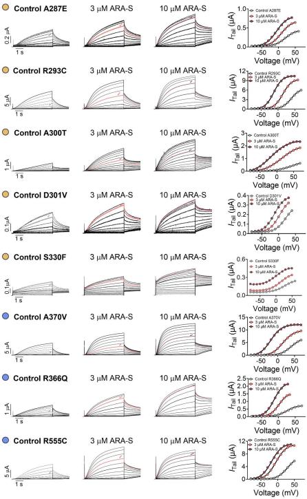 ARA-S = +15.3 mV, Itailmax; 3 µM ARA-S = 9.8 µA, V50; 10 µM ARA-S = -20.7 mV, Itailmax; 10 µM ARA-S = 12.1 µA. R555C: