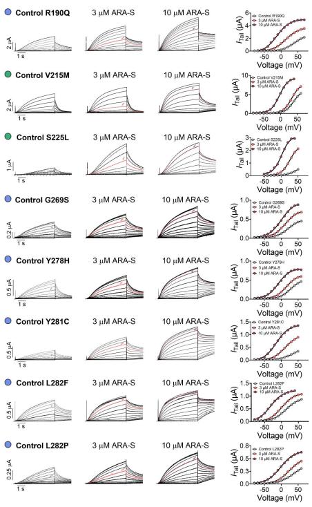 14.4 mV, Itailmax; 10 µM ARA-S = 1.4 µA. L282F: V50;ctrl = +34.9 mV, Itailmax;ctrl = 0.5 µA, V50; 3 µM ARA-S = +20.7 mV,