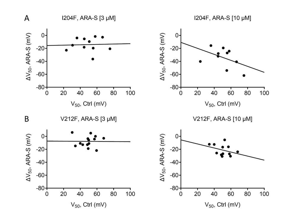 Supplementary Figure 4: Relation between intrinsic V50 and the ARA-S V50 effect in mutants I204F