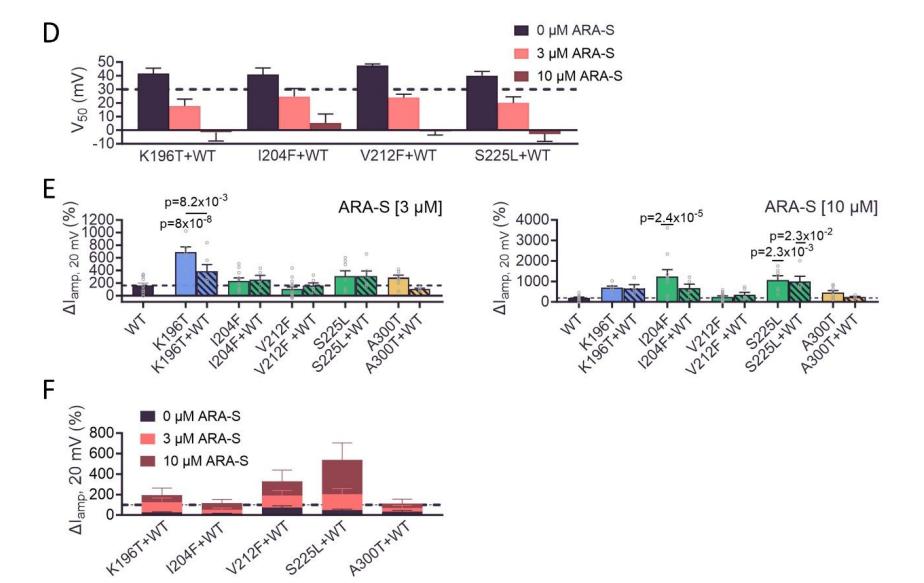 The dashed line denotes the V50 of WT KV7.1/KCNE1 under control conditions (without ARA-S; +30