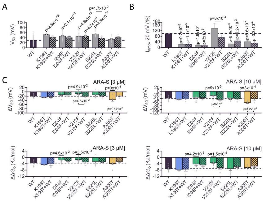 V50; 10 µM ARA-S = -12.6 mV, Itailmax; 10 µM ARA-S = 2.2 µA. A370V: V50;ctrl = +41.0 mV, Itailmax;ctrl = 7.0 µA, V50; 3 µM