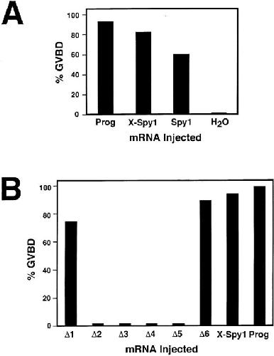 Figure 2. Human Spy1 induces GVBD in Xenopus oocytes. (A) Oocytes were injected with the indicated mRNA, incubated with progesterone (Prog) as a positive control, or injected with H2O as a negative control, and scored for GVBD by the formation of a white spot on the animal pole. This graph is the composite of three independent experiments. (B) Deletion mutants of Xenopus Spy1 define a minimal activation domain of X-Spy1. Oocytes were injected with the indicated mRNA or incubated with progesterone and scored for GVBD. Deletion mutants are missing the following aa: Δ1 (5–53), Δ2 (54–94), Δ3 (98–137), Δ4 (137–170), Δ5 (173–218), and Δ6 (218–268).