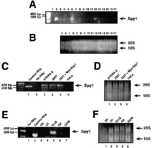 Figure 3. Human Spy1 mRNA is present in a variety of human tissues and immortalized cell lines. (A) RT-PCR of mRNA from 15 different human tissues. Lane 1 is a negative RT-PCR control containing no mRNA. Lane 2 is a positive RT-PCR control using control RNA with control primers. Human tissue samples are as follows: lane 3, thymus; 4, salivary gland; 5, liver; 6, fetal brain; 7, adrenal gland; 8, bone marrow; 9, fetal liver; 10, lung; 11, skeletal muscle; 12, thyroid; 13, brain/cerebellum; 14, heart; 15, placenta; 16, spleen; 17, trachea. (B) Control formaldehyde gel demonstrating the quality and quantity of the mRNA used in A. (C) RT-PCR of mRNA prepared from Ntera-2 cells (lane 3), 293T cells (lane 4), Spy1-transfected 293T cells (lane 5), and HeLa cells (lane 6). Lanes 1 and 2 are RT-PCR controls with a control mRNA and no mRNA, respectively. (D) Control formaldehyde gel demonstrating the quality and quantity of the mRNA used in C. Lanes 1–4 correspond to lanes 3–6 in C. (E) RT-PCR of mRNA prepared from synchronized 293T cells at various stages of the cell cycle. Lanes 1 and 2 are RT-PCR controls with no mRNA and control mRNA, respectively. (F) Control formaldehyde gel demonstrating the quantity and quality of the mRNA used in E. Lanes 1–5 correspond to lanes 3–7 in E.