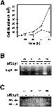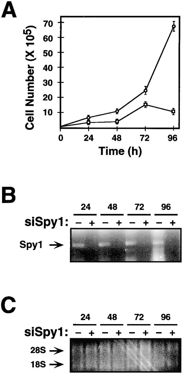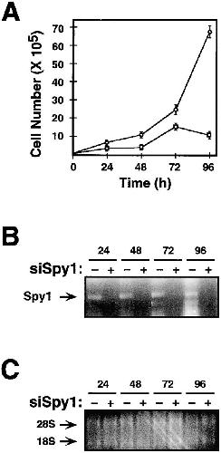 Figure 9. Endogenous Spy1 is required for normal cell growth. Spy1 RNA was depleted using RNA interference. (A) 293T cells were transiently transfected with siRNA directed against Spy1 (siSpy) (□) or siluc-GL2 control (siCntl) oligonucleotides (○). 24 h after transfection, triplicate plates were counted by trypan blue exclusion. The surviving cell number was graphed as an average of three plates (±SEM). (B) mRNA was isolated from remaining cells from each time point and was subjected to RT-PCR analysis. Lanes indicated with a plus have been treated with siSpy, and lanes indicated with a minus have been treated with siCntl. (C) Control 1.2% agarose formaldehyde gel demonstrating the quantity and quality of the mRNA used in B.