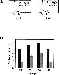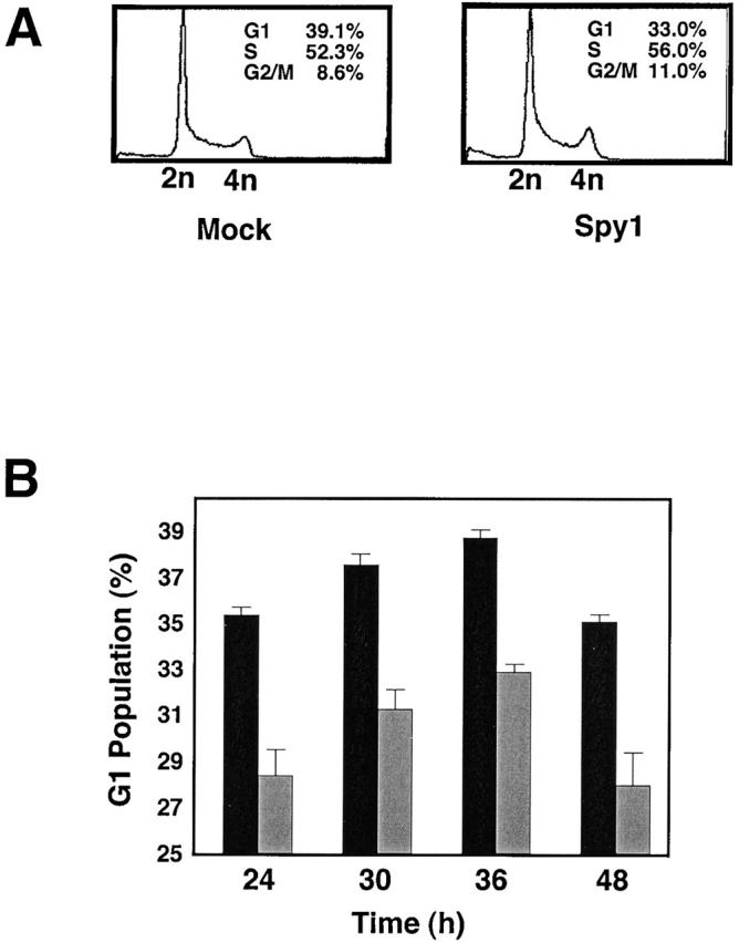 Figure 8. Speedy increases cell division and decreases the G1 population. 293T cells were transiently transfected with empty vector or myc–Spy1. Cells were collected 24, 30, 36, and 48 h after transfection and analyzed by flow cytometry. (A) A representative FACS® profile of cells overexpressing empty vector (mock) or myc–Spy1. (B) Graphic representation of the percentage of cells in G1 phase. Mock, black bars; myc–Spy1, gray bars. Error bars represent the SEM of four independent experiments.