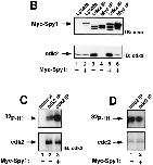 Figure 10. Depletion of Spy1 protein decreases cdk2-associated kinase activity and slows movement of cells into M phase of the cell cycle. (A) Mitotic index of cells expressing siSpy or siluc-GL2 (siCntl) 72 h after transfection. Error bars represent the average of three separate transfections. This is one representative experiment of three. (B) FACS® analysis of siSpy- and siCntl-expressing cells 72 h after transfection. Data were analyzed by M-cycle. One representative experiment of three is shown. (C) Cdk2-associated histone kinase activity was measured for cells transfected for 72 h with siSpy and siCntl. Data were quantitated using NIH Image 1.62. Similar alterations in kinase activity are observed over a range of time points. (D) Western blot control demonstrating that endogenous Spy1 protein is depleted 72 h after transfection of siSpy siRNA.