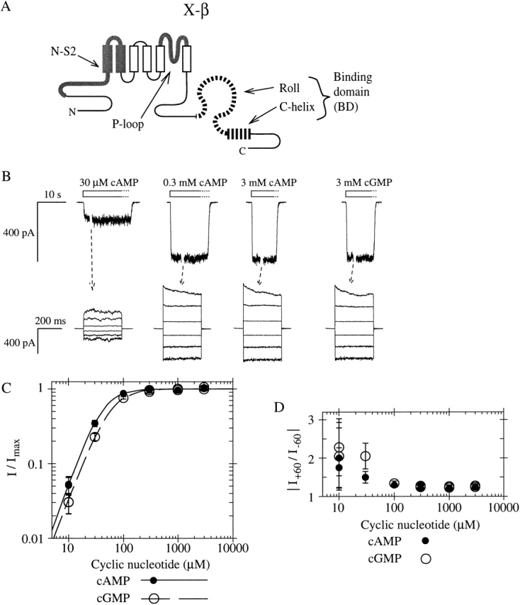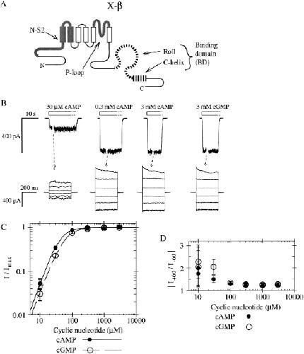 Figure 1. A chimeric CNG channel subunit containing the BD from a modulatory (β) subunit forms a functional homomeric CNG channel. (A) Schematic of CNG channel subunit sequence showing six transmembrane segments (vertical rectangles) and a cytoplasmic COOH-terminal binding domain with two parts: the roll subdomain (a β-roll flanked by A- and B-helices, shown as an omega-shaped loop) followed by the C-helix (horizontal rectangle). Chimera X-β consists of α subunit bCNG1 sequence (thin black lines) with N-S2 region and P-loop replaced by those of the α subunit fCNG2 (thick gray), and the BD replaced by that of the β subunit rCNG5 (striped). (B, top traces) Macroscopic currents from X-β homomeric channels in an inside-out patch, elicited in response to perfused cyclic nucleotide (open bars). Washout of agonist takes several seconds (dotted outline of bars). Holding voltage is â80 mV. Gap in each current trace during perfusion represents an arbitrary interval during which the voltage-step protocol was performed. (bottom traces) Currents elicited in steady-state concentrations of cyclic nucleotide (as indicated in top traces) were measured during voltage pulses from 0 mV to potentials between +100 and â100 mV in intervals of 40 mV. Traces are averages of duplicate trials and are leak subtracted. (C) Relative currents from the patch shown in B at â100 mV in response to cAMP (closed circles) or cGMP (open circles). Lines show fits of the Hill equation with parameters (± SE) as follows: for cAMP (solid line), K1/2 = 40.3 ± 2.8 μM, h = 2.08 ± 0.16; for cGMP (dashed line), K1/2 = 57.1 ± 4.0 μM, h = 1.94 ± 0.13; Imax,cAMP/Imax,cGMP = 0.996 ± 0.021. (D) Outward rectification in the same experiments shown in C, measured by the ratio of currents at +60 and â60 mV for different agonist concentrations.