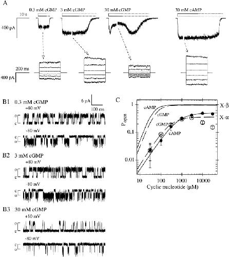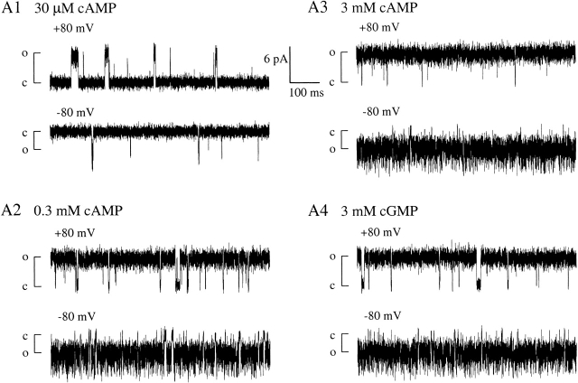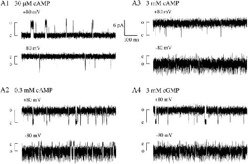 Figure 2. Single-channel recordings of homomeric X-β channels show high efficacy of opening with either cAMP or cGMP. (A1–A4) Typical 750-ms excerpts of recordings from one single-channel patch at +80 and −80 mV, with steady-state concentration of agonist as indicated; closed and open state current levels are marked by c and o, respectively.