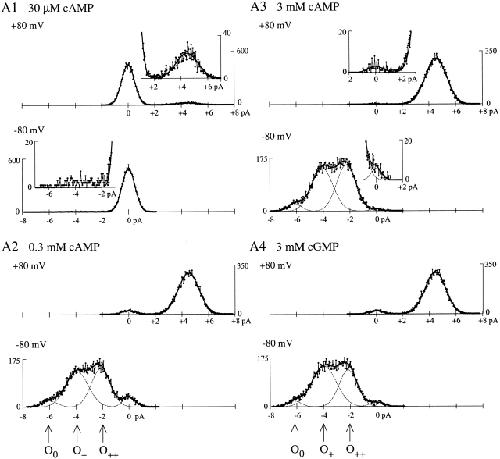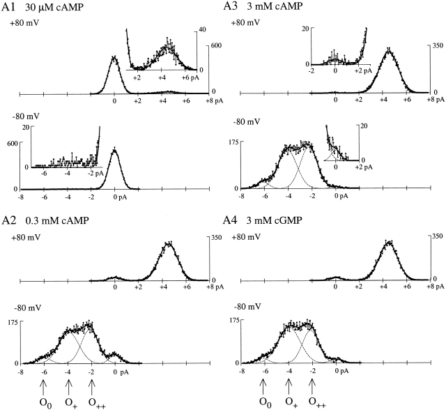 Figure 3. X-β has normal single-channel conductance. (A1–A4) All-points current amplitude histograms compiled from the excerpts in Fig. 2 (A1–A4 respectively). Insets expand the feet of histograms in A1 (30 μM cAMP, very low Popen) and A3 (3 mM cAMP, very high Popen). With the exception of the histogram in A1 at −80 mV (materials and methods), the complete histograms (connected dots) were fitted with a sum (solid line) of Gaussian peaks (dashed lines). Arrows mark current means for multiple open states at −80 mV: O0 (unprotonated), and O+ and O++ (single and doubly protonated, respectively). Popen values from the excerpts are as follows: in 30 μM cAMP, 0.0745 at +80 mV and 0.015 at −80 mV; in 300 μM cAMP, 0.943 at +80 mV and 0.9299 at −80 mV; in 3 mM cAMP, 0.9929 at +80 mV and 0.9905 at −80 mV; and in 3 mM cGMP, 0.9523 at +80 mV and 0.9671 at −80 mV.