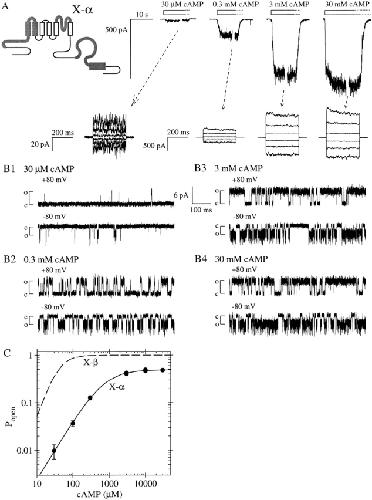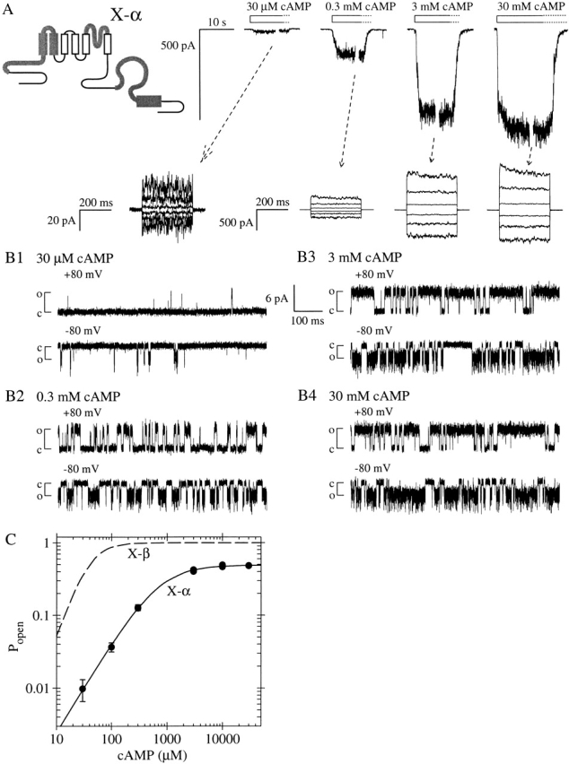 Figure 4. Chimeric CNG channel subunit X-α containing BD from the α subunit fCNG2 is less efficiently activated by cAMP than is X-β. (A) Schematic shows sequence of X-α is identical to that of X-β except that the BD sequence is that of fCNG2. (top traces) Macroscopic current traces from homomeric X-α channels elicited by the indicated concentrations of cAMP. (bottom traces) Currents during voltage steps at indicated steady-state cAMP concentrations (tested as in Fig. 1). (B1–B4) Excerpts of single X-α channel recordings at indicated potentials and steady-state cAMP concentrations (collected as in Fig. 2). Popen values from the excerpt in B4 (30 mM cAMP) are 0.778 at +80 mV and 0.646 at −80 mV. (C) Dose–response data (closed circles) for X-α activation by cAMP at −100 mV, from the patch shown in A. Solid line shows Hill equation fit with K1/2 = 717 ± 47 μM, h = 1.241 ± 0.051, and the graph is normalized with Pmax,cAMP at cAMP set to be 0.49, the mean from single-channel measurements. For comparison, the dashed line shows cAMP dose–response curve for X-β, taken from Fig. 1 C and normalized using the Pmax,cAMP of 0.98 derived from single-channel measurements.
