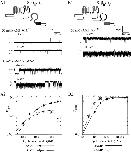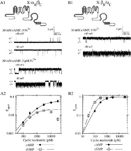 Figure 6. Chimera X-αR/βC is poorly activated by cyclic nucleotide, whereas the complementary chimera X-βR/αC is efficiently activated by cyclic nucleotide. (A1) X-αR/βC contains the roll subdomain from fCNG2 and the C-helix from rCNG5. Single-channel recordings were made at indicated potentials with a steady-state concentration of 30 mM cAMP, with or without 5 μM Ni2+ present. (top traces) Pmax is low in absence of Ni2+ (Popen = 0.004 at +80 mV and 0.012 at −80 mV). (bottom traces) Channel opening is potentiated by Ni2+, showing only one channel is present (Popen = 0.874 at +80 mV and 0.878 at −80 mV). (A2) Mean dose–response data for X-αR/βC activation by cAMP (closed circles) and cGMP (open circles) at −100 mV, compiled from four patches expressing macroscopic currents (materials and methods); graph is normalized using Pmax,cAMP = 0.056, the mean from single-channel measurements. Lines show Hill equation fits with parameters (±SEM) as follows: for cAMP (solid), K1/2 = 1,570 ± 370 μM, h = 0.932 ± 0.065; for cGMP (dashed, excluding data >3 mM), K1/2 = 511 ± 37 μM, h = 1.120 ± 0.044; Imax,cAMP/Imax,cGMP = 2.85 ± 0.30. (B1) X-βR/αC contains the roll subdomain from rCNG5 and the C-helix from fCNG2. Single-channel recording excerpt (no Ni2+ present) shows high Pmax in 30 mM cAMP (Popen = 0.9878 at +80 mV and 0.9896 at −80 mV). (B2) Dose–response data for X-βR/αC activation by cAMP (solid circles) and cGMP (open circles) at −100 mV, from a patch with maximal current ∼400 pA; graph is normalized using Pmax,cAMP = 0.954, the mean from single-channel measurements. Lines show Hill equation fits with parameters (±SE) as follows: for cAMP (solid), K1/2 = 288 ± 20 μM, h = 1.37 ± 0.12; for cGMP (dashed), K1/2 = 95.8 ± 9.2 μM, h = 1.95 ± 0.22; Imax,cAMP/Imax,cGMP = 1.0078 ± 0.030.