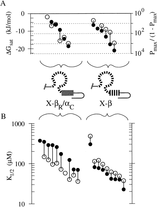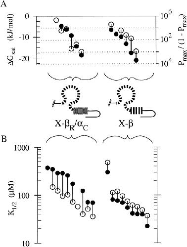 Figure 7. Chimeras X-βR/αC and X-β exhibit different agonist selectivity. (A) Points plot the efficacies of the two chimeras obtained from single-channel patches from distinct oocytes. Each vertical line connects a solid and an open point plotting data for cAMP and cGMP, respectively, obtained from an individual patch. For some patches, efficacy was only measured for one agonist so only one point is plotted without a vertical line. Efficacies are plotted as ΔGsat (left axis) or equivalently as Pmax/(1 − Pmax) on a logarithmic scale (right axis). (B) Points plot the K1/2 values of the two chimeras obtained from macroscopic current patches from distinct oocytes, with cAMP and cGMP data represented as in A.