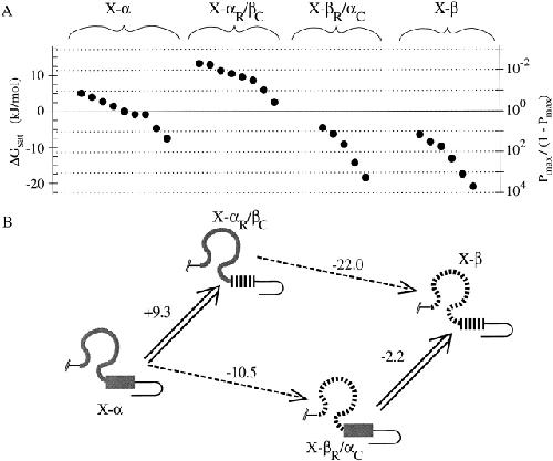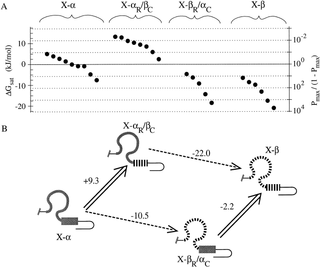 Figure 8. Analysis of cAMP activation data for chimeras using a thermodynamic linkage cycle. (A) Efficacies of cAMP activation for all single-channel patches in this study are plotted using the same axes as in Fig. 6 A; each solid point plots data obtained from an individual patch from a distinct oocyte. (B) BDs of four chimeras arranged at the corners of the linkage cycle. Wide arrows represent replacements of fCNG2 C-helix by rCNG5 C-helix; dashed arrows represent replacements of fCNG2 roll subdomain by rCNG5 subdomain. For each replacement, ΔΔGsat,cAMP (defined as the change in ΔGsat,cAMP that results from performing that replacement) is shown, in units of kJ/mol. The independence hypothesis fails because parallel sides of the cycle have different values of ΔΔGsat,cAMP.