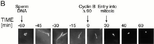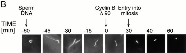 (B) Immunofluorescence microscopy showing the morphology of sperm nuclei incubated for different time points in S100 fractions as in A and subsequently fixed and stained with DAPI. Note that chromosome condensation still occurs in the S100 fraction.