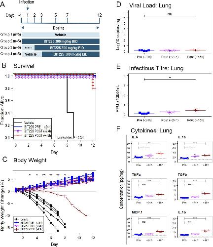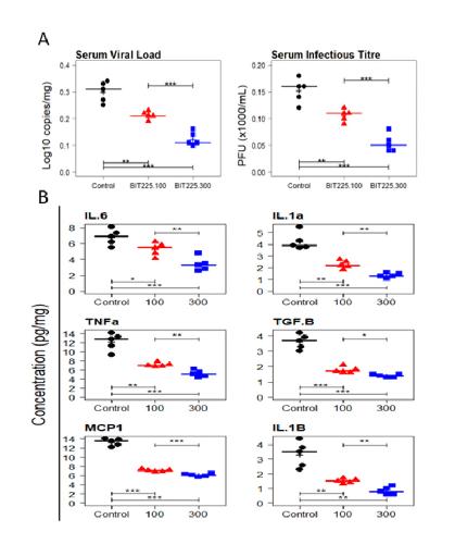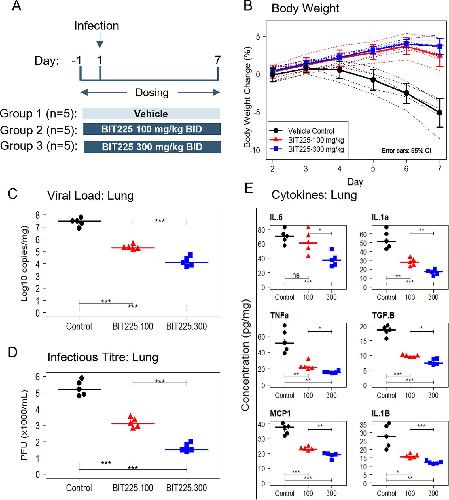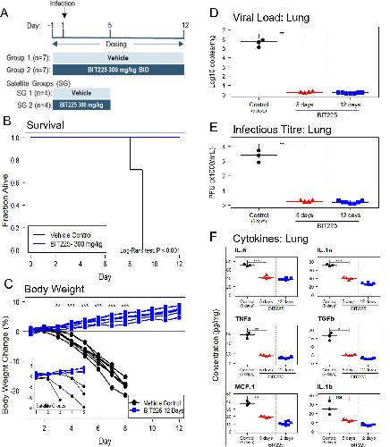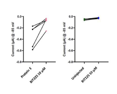 Post-infection treatment with the E protein inhibitor BIT225 reduces disease severity and increases survival of K18-hACE2 transgenic mice infected with a lethal dose of SARS-CoV-2.,
